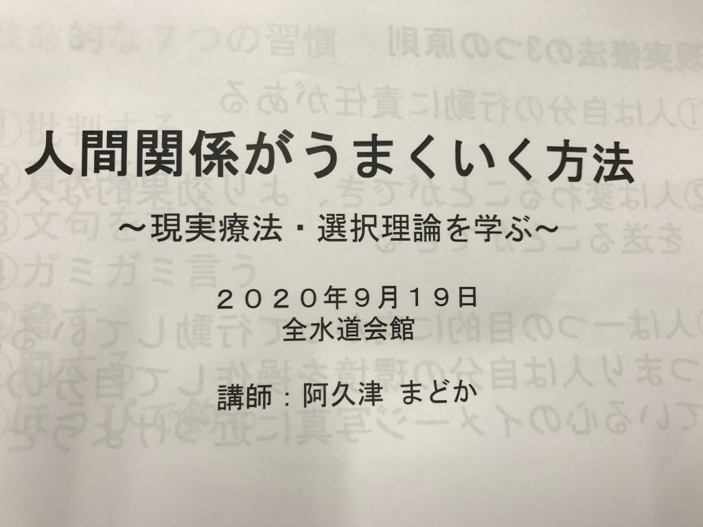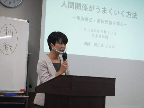 新着情報 研究会が行われました。 2020年9月24日 9/19 (土)、水道橋の全水道会館にて卒業生のための研究会「人間関係がうまくいく方法~現実療法・選択理論を学ぶ~」が行われ、当センター相談室長の阿久津まどか先生がお話ししました。 カテゴリ:卒業生向け研究会 「研究会が行われました。」 「卒業生のための研究会が行われました。」